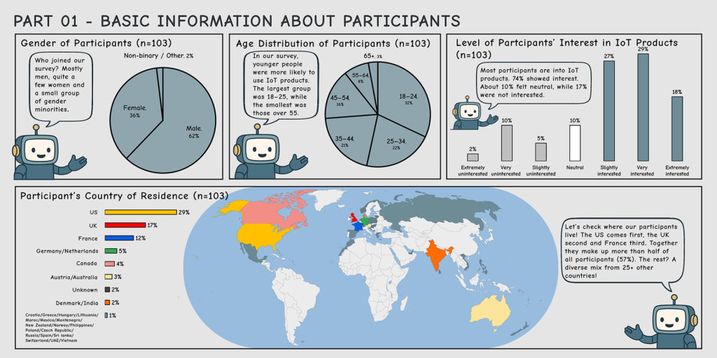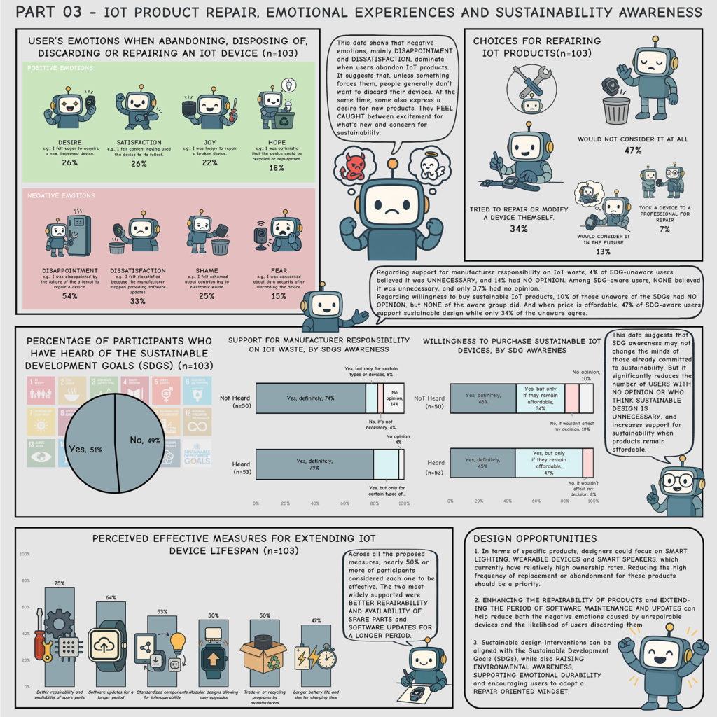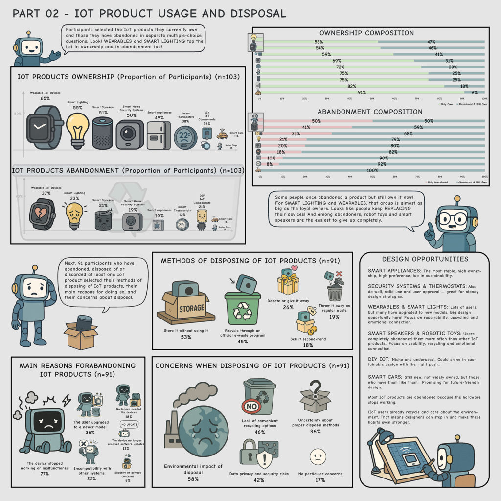 This project explores the sustainability challenges of IoT products through a data visualization approach, focusing on users’ real-life experiences of adoption, abandonment, and repair. Conducted in collaboration with researchers from Royal College of Art, the study combines qualitative user research with creative data storytelling methods. Insights gathered from participants were translated into data comics, making complex behavioral patterns and emotional responses more accessible and engaging. The project contributes to ongoing discussions on sustainable design practices and has led to a co-authored paper submitted to IHM’26.